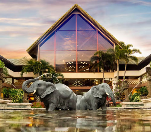Inspirado en el Caribe, con cascadas y una gran piscina.